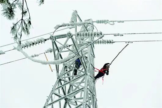 抢救人员正在对被冻雨破坏的电网进行抢救