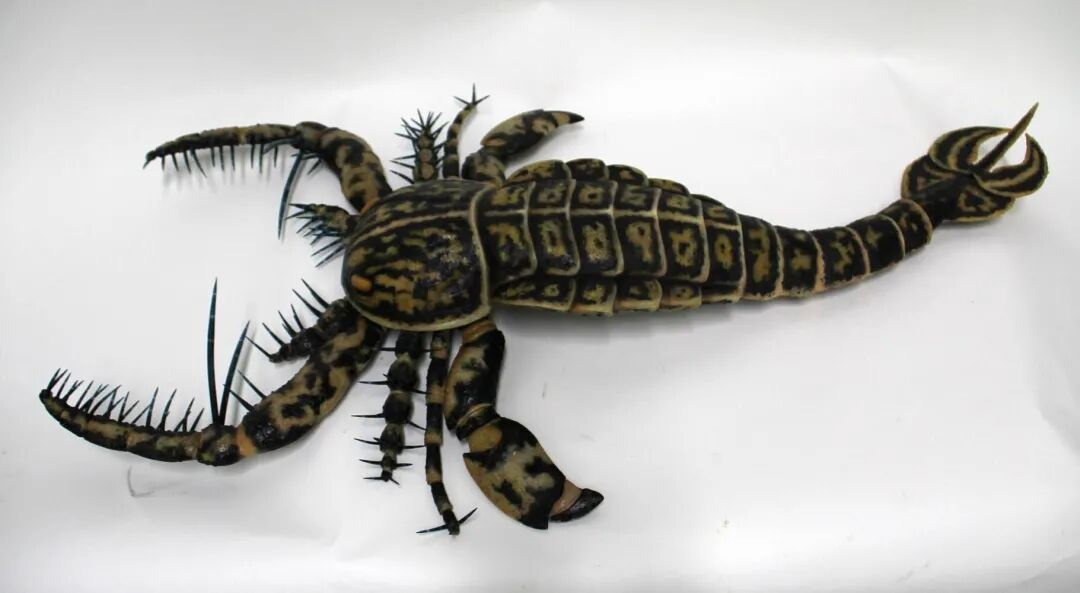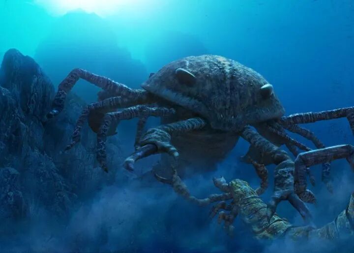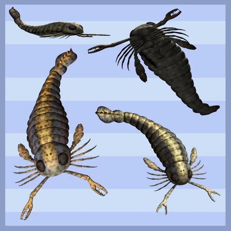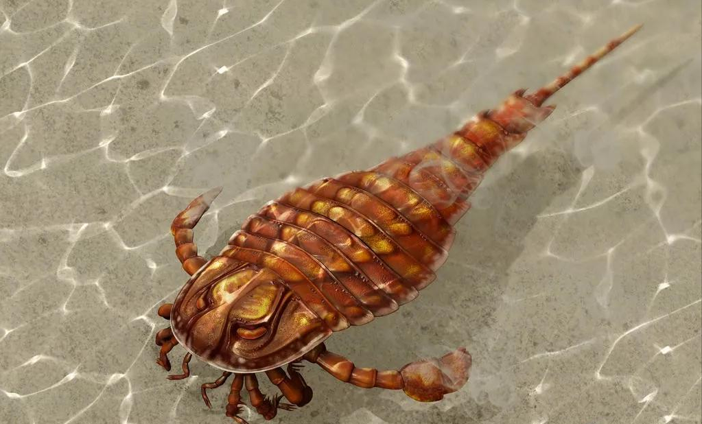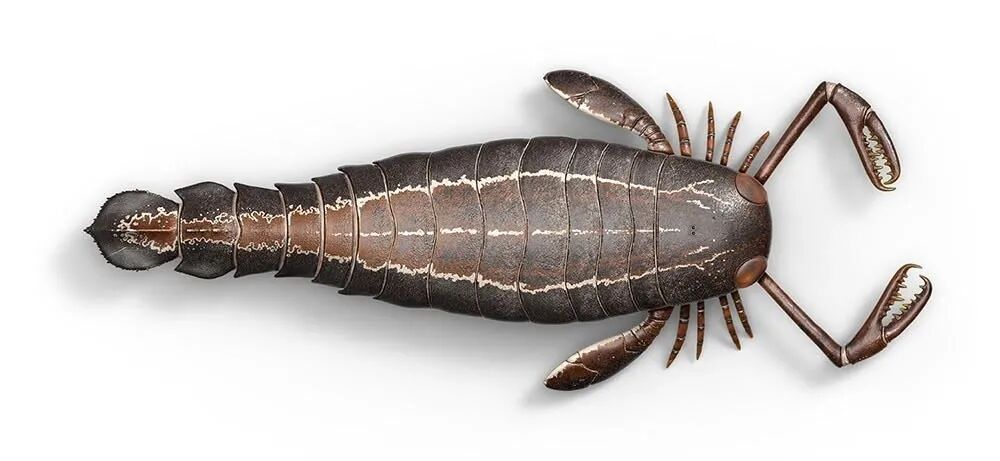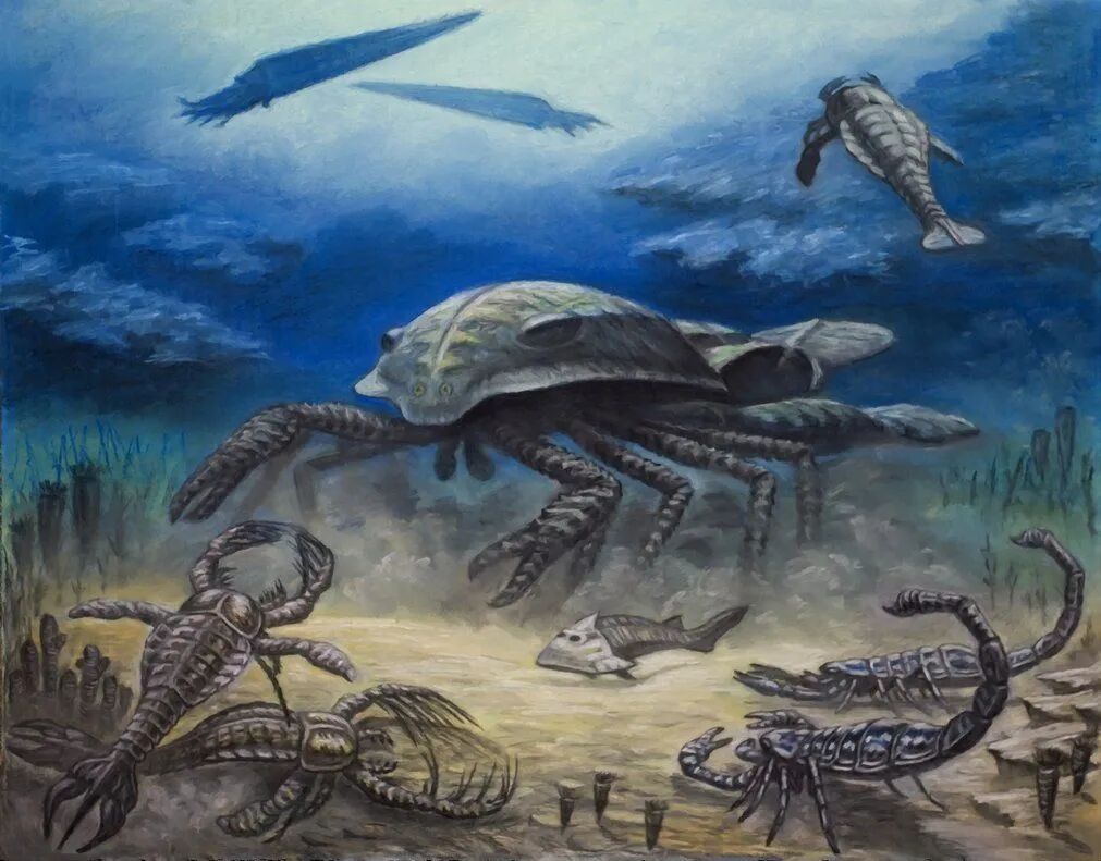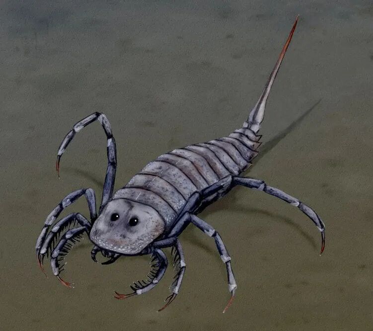 奥陶纪生物大灭绝导致了85%的生物消失,三叶虫被迫把海洋霸主位置让给了声势浩大的鹦鹉螺类。而这时一种奇特的生物竟悄无声息地进化了出来,它们形似蝎子,却有着鳄鱼的身材和巨大的鳌,因为形似我们称其为“海蝎”,它就是之后志留纪的海洋霸主、海洋中的恐怖化身——“板足鲎(hòu)”(Eurypterida)。