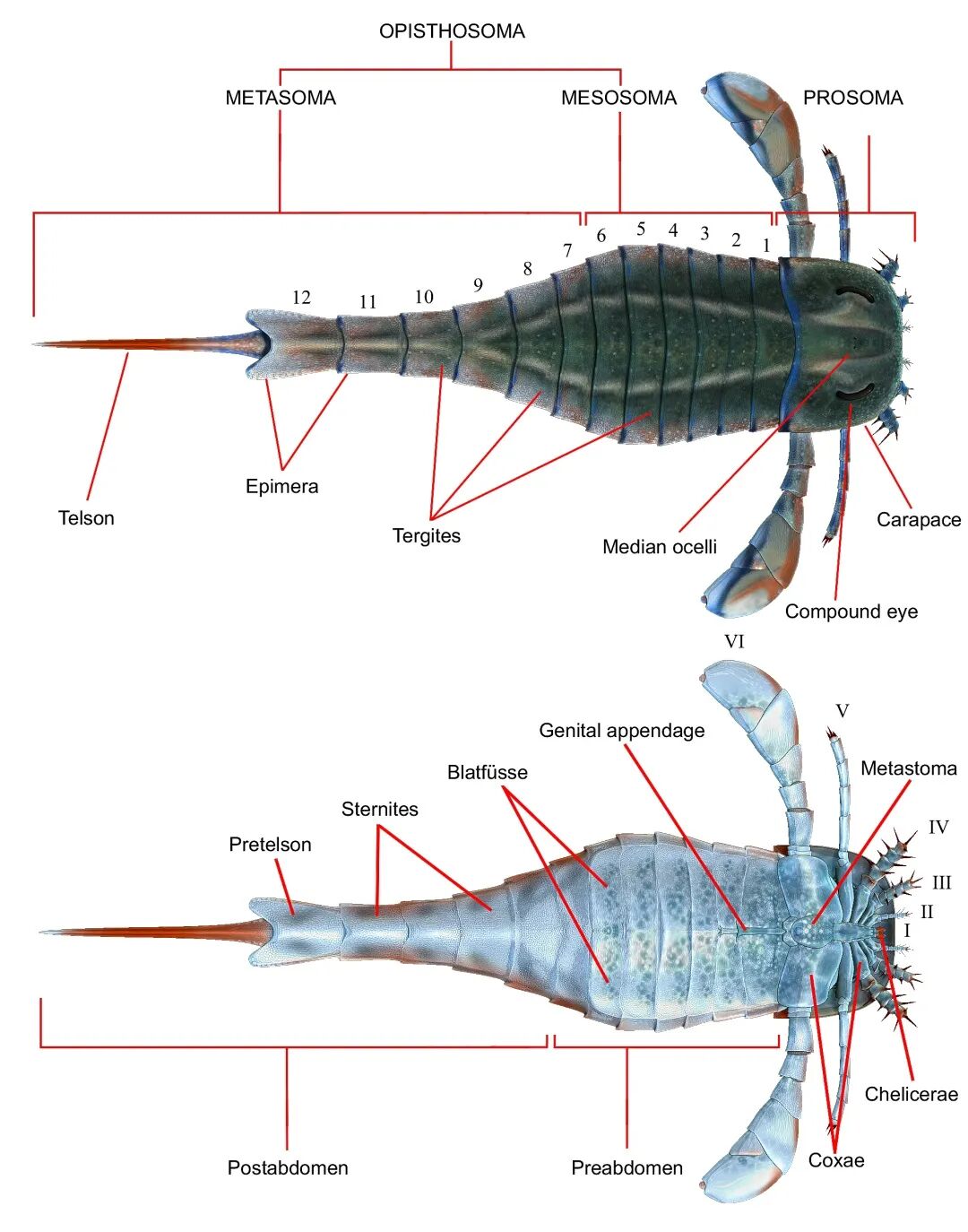 更激进的翼肢鲎把尾部进化成带毒的尖刺,如西利蒙斯鲎科(Slimonidae),在抓住猎物的时候,可以直接把近10cm的尖刺插入猎物体内。