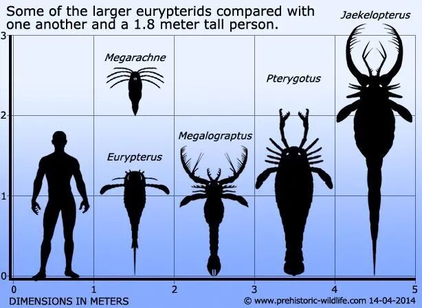 也有部分板足鲎选择用体型压倒敌人,在志留纪到志留纪不停地堆体积。早泥盆世的莱茵耶克尔鲎(Jaekelopterus),体长可达2.5米,是史上最大的海洋节肢动物,虽然那时的海洋霸主早已易主。其他种类的板足鲎也各具特色,与以上几种相差不大,有了这几种大杀器,使得板足鲎在3000万年间一直处于顶端地位。
