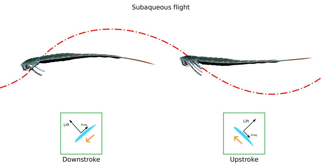 翼肢鲎(Pterygotus)作为板足鲎的代表,也是板足鲎成功的最重要一步。翼肢鲎最长可以达到2.3米,有一对卡姿兰大复眼和一对小眼,最重要的是他的第五对附肢演化成了用于划水的桨,并将前辈留下的不是钳发展壮大,最前六节背节是分管呼吸的腮和生殖器官。超强的机动能力和捕食能力,让板足鲎快速地占领了食物链的顶端,甚至挺过了奥陶纪生物大灭绝,而那些没有进化成划水桨的鲎类则永远的留在了奥陶纪。翼肢鲎全身的结构让它们成为了全海洋中最会划水的生物,拳打老东家鹦鹉螺,脚踢各种初代目鱼类,甚至狠起来连同类都全部肢解。