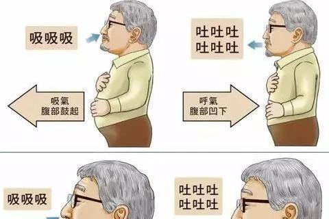 患者取平卧位,将左手放置在上腹部,右手放在前胸部,放松并呼吸,经鼻吸气,从口呼出,尽量保持胸廓不动,腹部伸缩,10-15分钟每次,一天2-3次,可以很好地改善肺功能。