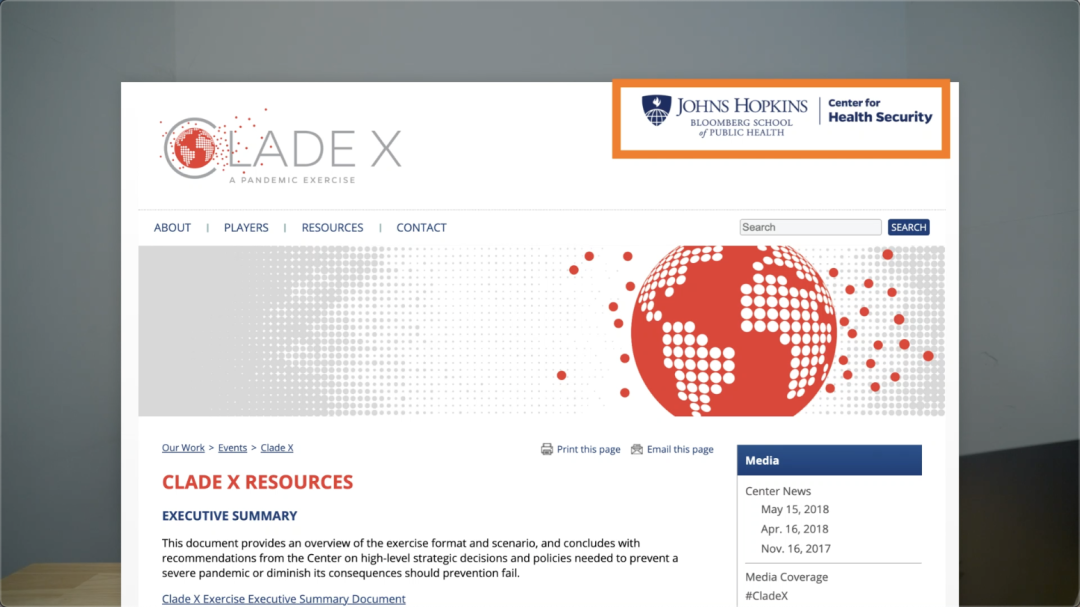 2018年,约翰·霍普金斯大学卫生安全中心进行了一场全球大流行病的建模演习。在这场演习中,名为“Clade X”的病毒出现在德国的法兰克福和委内瑞拉的首都加拉加斯。Clade X是一种传染性中度、致命性中度的人传人病毒,主要通过咳嗽和喷嚏传播。被感染者会出现发热、咳嗽、乏力等症状。
