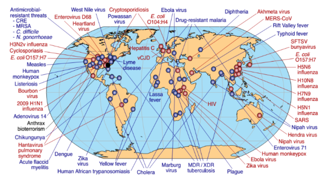 这张地图里,红色标注的是新出现的病毒。蓝色,是重新出现的病毒。黑色,是被人类故意释放的病毒。