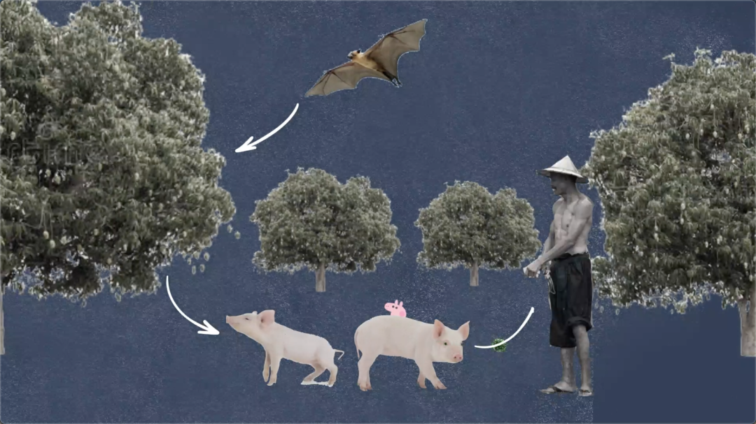 1999年,马来西亚第一次出现了尼帕病毒。这种人畜共患病毒的病例死亡率估计在40%到75%。当时的传染链是这样的:由于土地紧缺,当地农民把猪场建在了蝙蝠栖息地附近。果蝠吃芒果,残渣落到了猪圈里;猪吃了芒果残渣;人接触了猪。