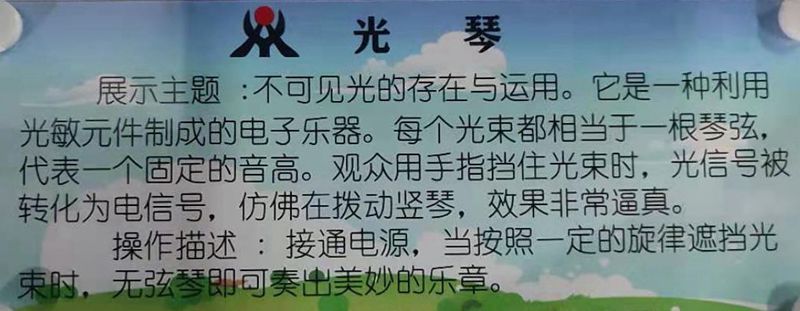 光琴是一种利用光敏元件制成的电子乐器。每个光束都相当于一根琴弦,代表一个固定的音符,用手指挡住光束时,光信号被转化为电信号,仿佛在拨动竖琴,效果非常逼真。
