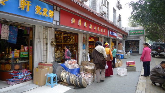 如果你在逛完成都著名景点「武侯祠」之后,继续向南边漫步,更是会闯入一大片藏人聚居区,形形色色的民族用品商店、藏装店、藏毯店、藏餐馆首尾相接,沿着街道两边排列,甚至会让你产生一种置身藏区街头的错觉。