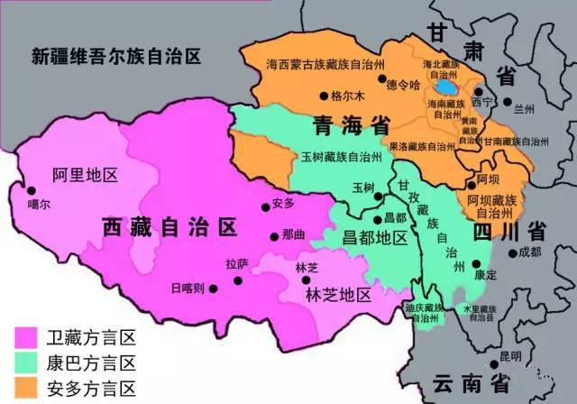 传统上,按照藏语三大方言的使用范围,藏区大体可以分为卫藏、康巴和安多三个大区。对应到今天的行政区划,西藏自治区只包含了其中的卫藏和一小部分康巴地区。