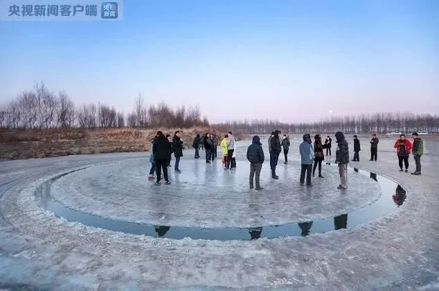 冰圈的大小和形态都不一样,有些个头很小,而且一个个孤立地漂浮在水面上,有些个头很大,还有一些就如北京郊区出现的,出现在冰层中。