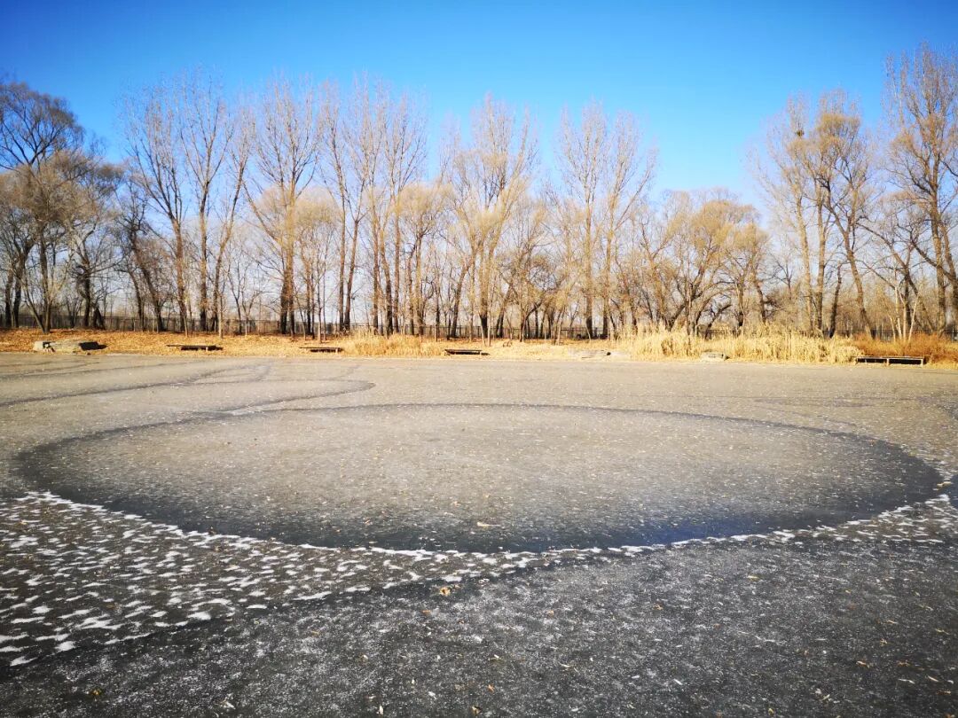 回到文章开头北京疑似冰圈的形成原因上来,根据供图者的描述,这是由于这个湖泊今年处于十年来的低水位,冰封期至今水位继续下降了约10cm,冰面沉降,造成湖心位置的冰面产生裂缝,湖水涌出一小部分,积存于裂缝周边,形成几个圆形水洼,短时间再次冰冻留下的痕迹,而且湖泊与周围的河流并无联动,所以可能不是冰圈。