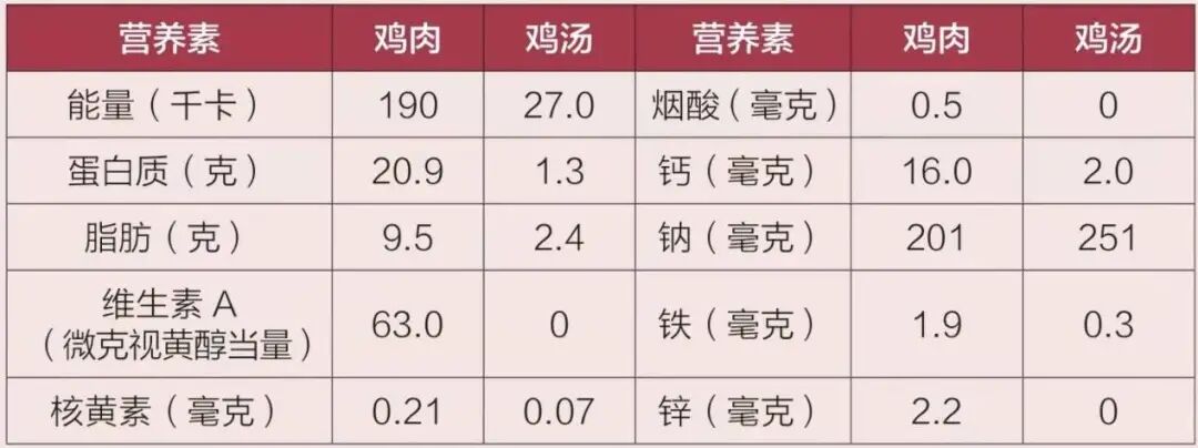 以鸡肉和鸡汤为例,鸡汤中除了盐的含量更胜一筹,其他各营养成分(包括脂肪)含量均在鸡肉之下。