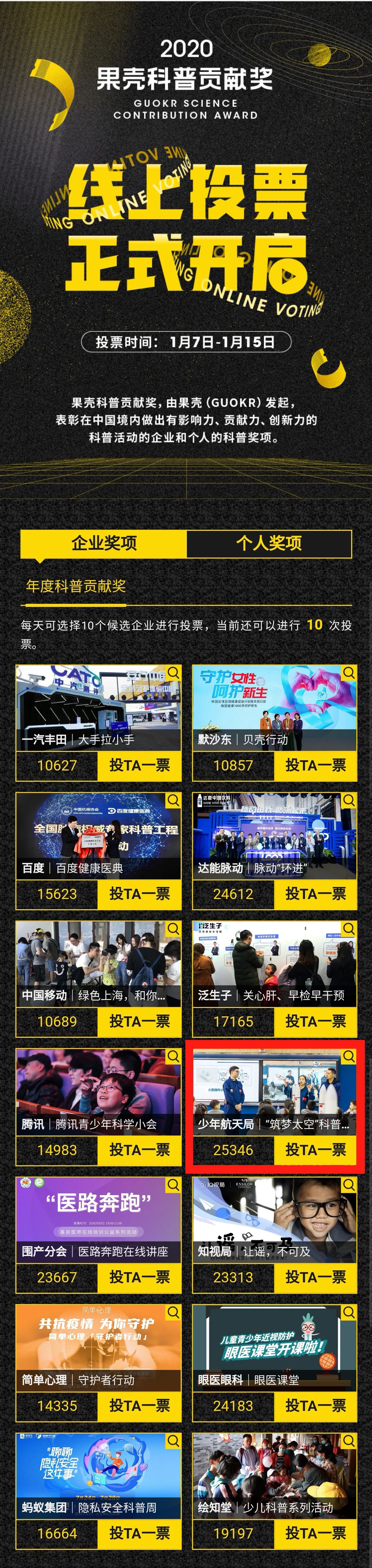 今天由果壳网发起的2020 · 果壳科普贡献奖线上投票活动落下帷幕我们的太空战略合作伙伴少年航天局作品《少年航天局“筑梦太空”科普工程》以 25346 票名列奖项候选人第一名--------------少年航天局“筑梦太空”科普工程是少年航天局推出的战略项目之一,是针对全国近2亿中小学生量身定做的大型系列国防科技文化普及活动。少年航天局“筑梦太空”科普工程不但是中国国防航天科技展示的重要窗口,也是中国航天文化的重要传播平台。通过独树一帜的公益科普+动手实践的培育模式,以走进中小学校园为基础,在寓教于乐的互动中启迪我国少年儿童的航天梦想,激发我国少年儿童的科学兴趣和想象力,是中国航天事业未来中坚力量梦想起步的摇篮。少年航天局加油!⬇️