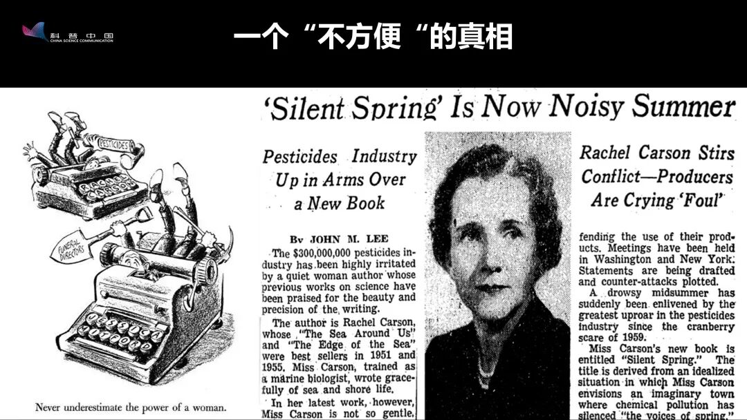 《寂静的春天》这本书现在看来可以被视为环境毒理学的开山之作,同时也是环境运动真正进入公众视野的一本标志性书籍——但在它刚刚被发表出来时,公众对它并不认可。为什么?因为它摧毁了一个明星产品,摧毁了一个对人类毒性低、对害虫毒性高,非常好用的农药。它建议“完全停止使用DDT”,但当时,传统农业生产过程各个环节的人都认为这是一种“何不食肉糜”的想法,同时,很多工业领域特别是有机合成领域的人也开始攻击。