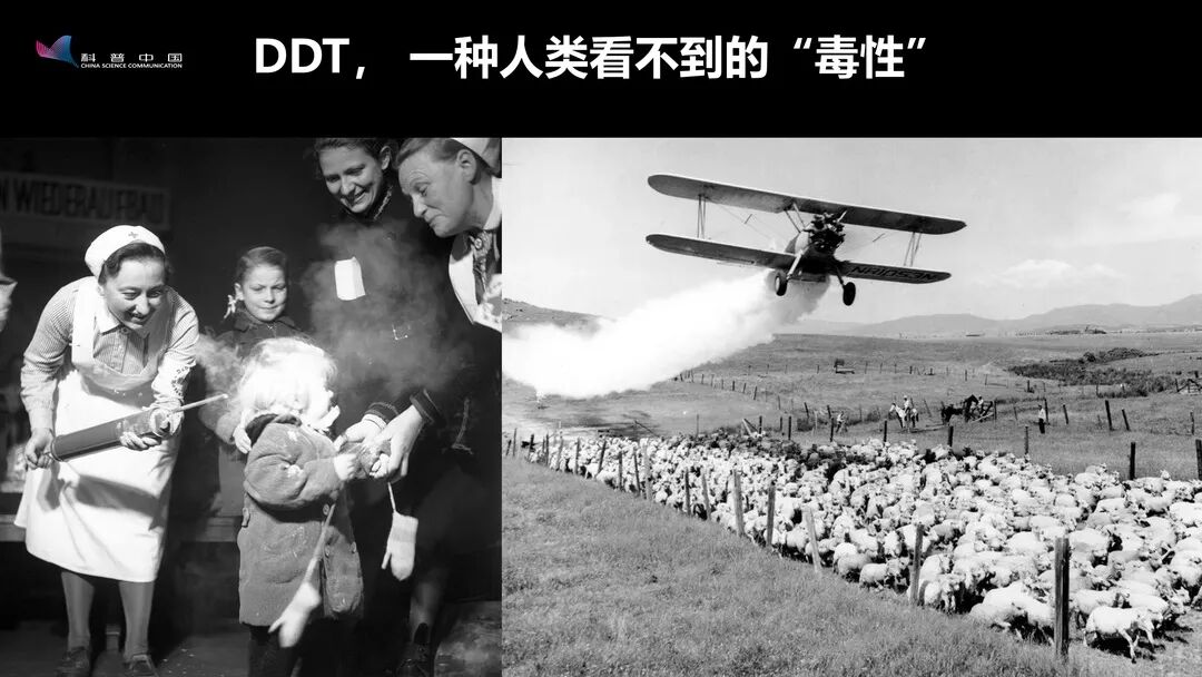 例如,DDT在上世纪四五十年代刚刚被发明出来时,曾被很大规模使用。左边这张照片是医护人员在给一个小孩子驱虫,喷的就是DDT。现在我们看到这样一幅图,可能会产生生理上的厌恶感,但在当时,现实情况就是如此。