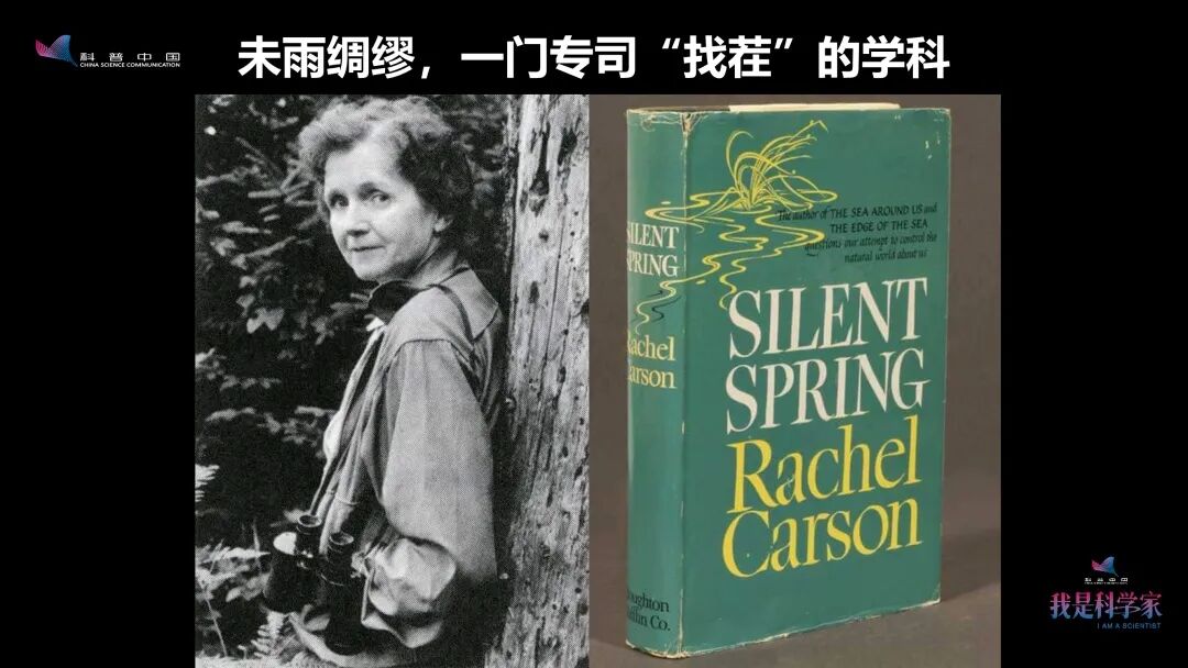 这时,有一位非常有先见之明的人,也是我们“找茬”专业的鼻祖——蕾切尔·卡森,她注意到,有一种声音消失不见了:春天没有鸟叫了。为此她写了《寂静的春天》,讲述了从DDT开始大规模使用到春天没有鸟鸣的故事。