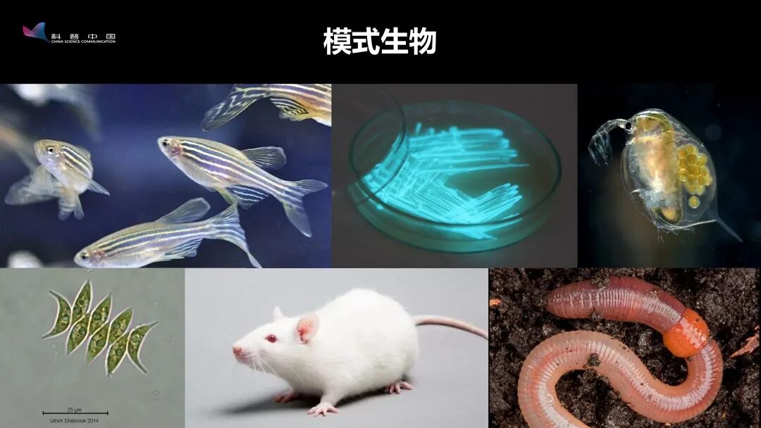 这是我们的科研团队。其中有大家很熟悉的实验动物,像小白鼠和蚯蚓;也有水生生态学研究里的生产者,比如藻类,以及初级消费者,比如水里游的枝角类的浮游动物大型蚤,还有高级捕食者,比如斑马鱼;另外,我们经常用的微生物是一种发光菌,它在暗环境下可以释放出荧光,非常好看。它们都是环境毒理学里经常用到的实验伙伴。除了畜牧业或兽医,学我们这个专业也可以接触到很多动物。