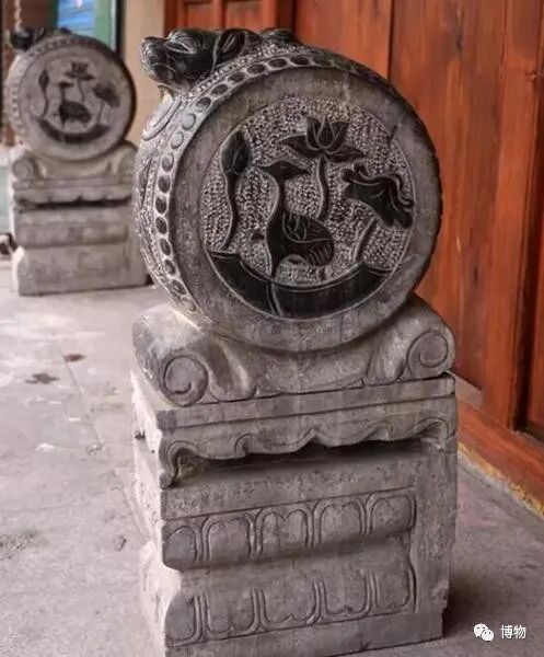抱鼓石根据形体不同大致可以分为两种,一种是方形鼓子,一种是圆形鼓子,它们都与门枕石连在一起,中间以宅门的门槛为界,抱鼓石在外,门枕石在内。