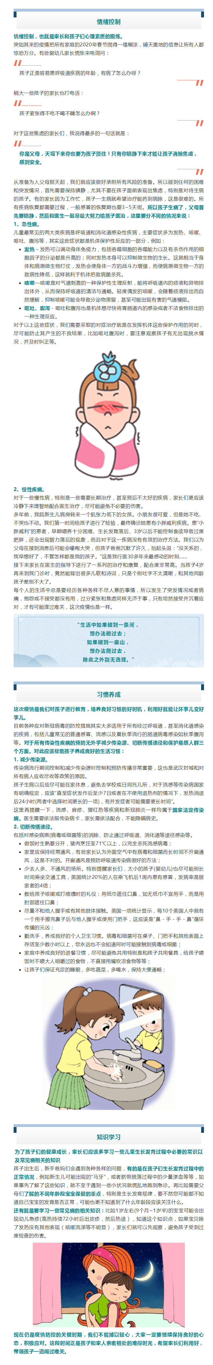 疫情发生一个多月以来,我们从恐慌到镇定,从手足无措到井然有序,全国齐心协力,抗疫工作已经取得不小的成效。非常时期,每个人的神经都时刻紧绷着,孩子们的微小不适都会被家长无限放大。近期我院儿科收到新手爸妈们的各种咨询,对此我院儿科宋红梅主任想和大家谈一谈:透过疫情,家长们在育儿方面还需要注意的一些事情。
