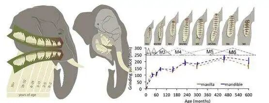 大象的臼齿还有一个特点,那就是其他哺乳动物的臼齿都是上下生长的,而大象的臼齿的生长过程则不同,是从大象嘴的内侧向外侧生长,这是大象牙齿的又一奇异之处。