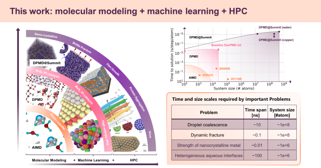 该成果通过高性能计算和机器学习将分子动力学极限提升了数个量级,达到了上亿原子的体系规模,同时仍保证了「从头算(ab initio)」的高精度,且模拟时间尺度较传统方法至少提高1000倍。