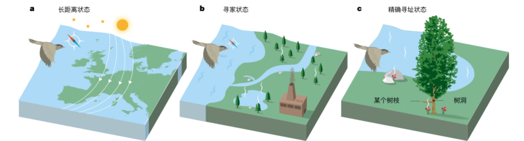 很难想象鸟类这种快速移动的生物,是如何用这样的地磁场实现10~30千米精度的导航的。至少它们需要对磁场有十分准确的感应。2018年,《自然》杂志刊登了一篇关于迁徙动物长距离导航和磁感的综述,其中总结了三种可能的磁感产生方式,分别为电磁感应、基于磁性粒子的磁感受和基于自由基对(radical pair)的磁感受。其中,基于自由基对的磁感受与量子力学紧密相关。