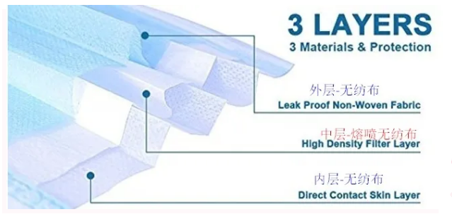 口罩,一般由三部分组成,其中最主要的材料,就是非织造布,它是通过把长短纤维通过不同的方式压合而成的,不同的纤维排列方式和功能不同。正因纤维的特殊排列方式,离子间无规律的布朗运动就会被吸附在纤维表面,无法穿透纤维间隙,同时随气流带入的粒子进入纤维迷阵后,不断地碰撞改变运动方向,加上纤维自身的静电吸附作用,能有效地降低穿透纤维层的粒子数量,从而起到一定的防护作用。