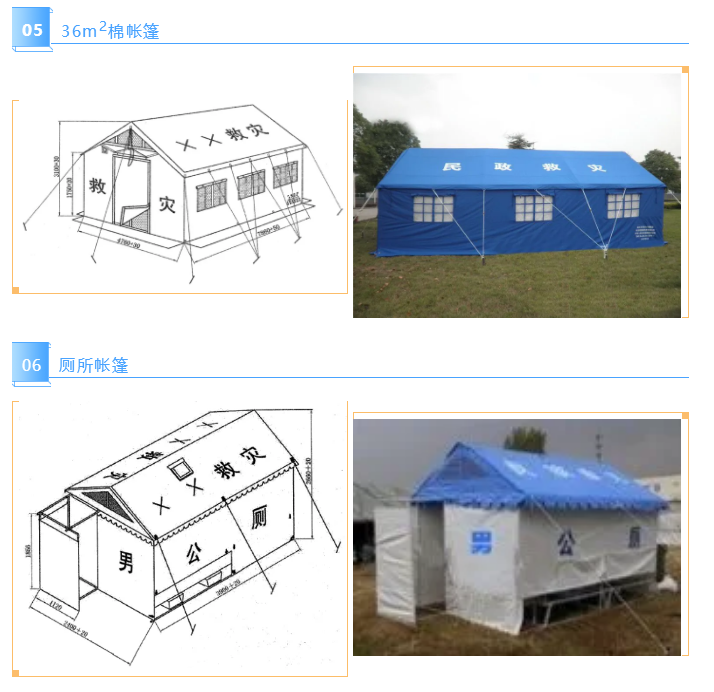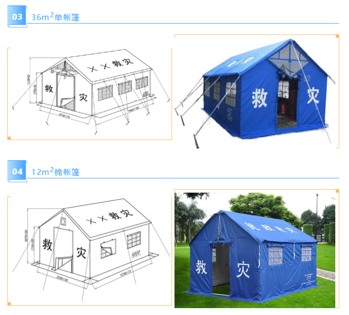 36m2帐篷供救灾指挥、灾后应急医疗救治、临时性校舍、救灾物资中转贮存及工作人员住宿等使用。