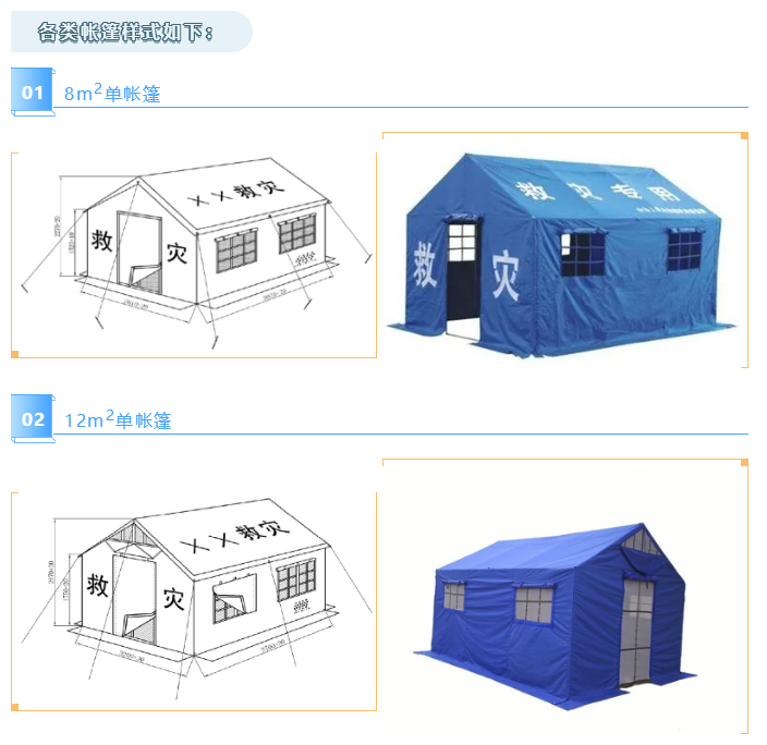 8m2和12m2帐篷供平原地区安置受灾群众使用,可容纳3~5人临时性住用。