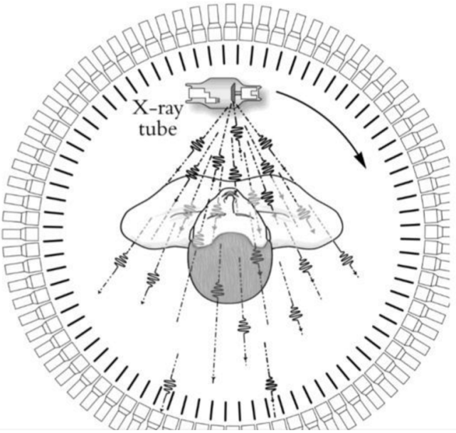 位于机器上方的X射线管发出X射线,X射线经过人体后会有所衰减,衰减后的X射线最终达到探测器上。探测器再根据衰减后的X线的量进行计算成像。