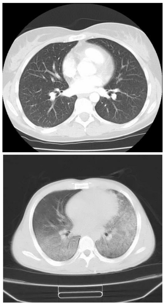 如下图的胸部CT结果示:上面的为正常的胸部CT,为“黑肺”,下面的为肺炎的CT表现,即为“白肺”。