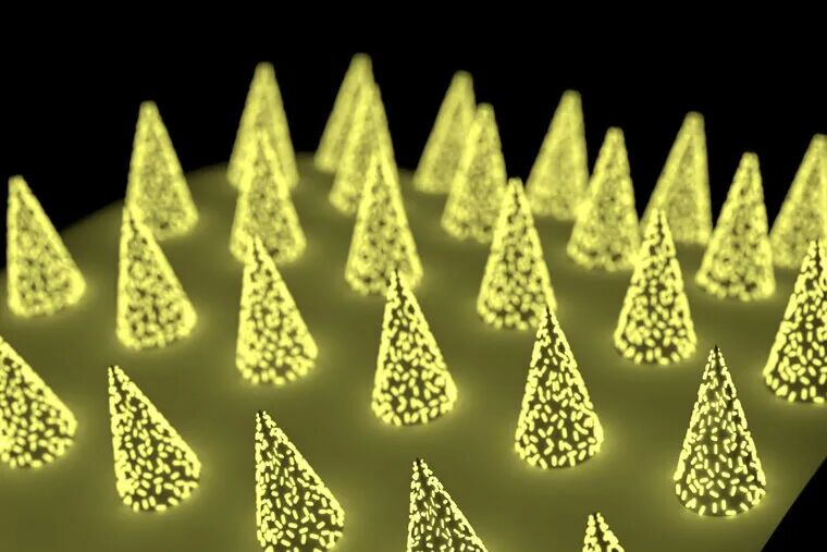 真皮细胞的组织间液中含有和疾病相关的标志物,如抗体、炎症因子等,但它们的浓度会远低于在血液中的浓度。据一项发表于《自然·生物医学工程》的新研究,科学家发明了一种无需抽血、无痛检测体内生物标志物的皮肤微针贴片。微针长 400微米,能深入到真皮组织,检测充斥细胞间的真皮组织间液(ISF)。此外,他们通过在贴片中应用了一种超亮的纳米荧光标记,能够使目标蛋白发出的荧光信号增强1400倍,从而被准确检测到。这一高灵敏度、无痛的皮肤微针贴片,有望被用于检测新冠病毒抗体等。