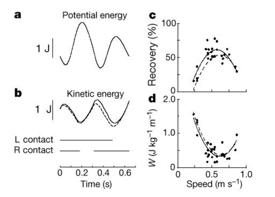 a、b 帝企鹅在0.54m/s行走速度时的重力势能和动能的波动图 c 、dy摇摆的能量回收效率 图源:文献1