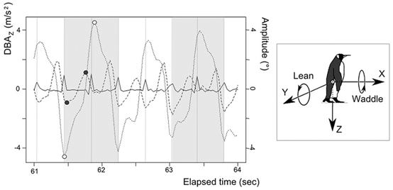 企鹅身体左右摇摆加速度随时间的变化,正值表示右侧倾斜,负值表示左侧倾斜 图源:文献2