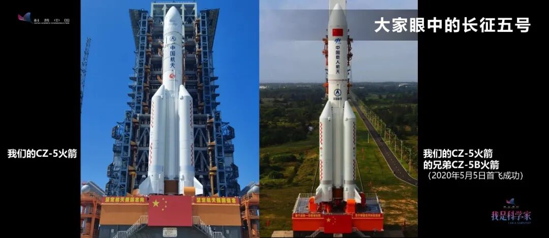 这是大家眼中的长征五号。左边和右边两幅图片,大家能不能分辨出区别?右边是今年5月5日发射的长五B遥一(CZ-5B),右边是长五的基本形(CZ-5),从外形上确实看不出太大区别。