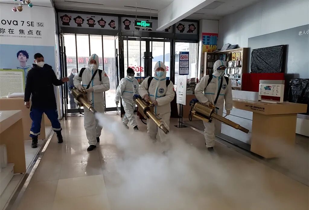 1月30日,蓝天救援队队员在河北石家庄一家商城开展消杀工作,为商城重新开门迎客做准备。