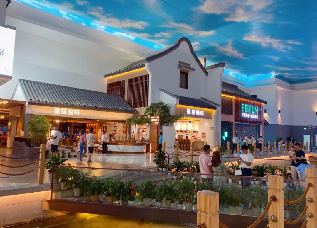 里面更是别有洞天,把苏州园林的小桥流水直接般进商场里,加上头顶的人造天空,简直就是澳门威尼斯人的苏州版。