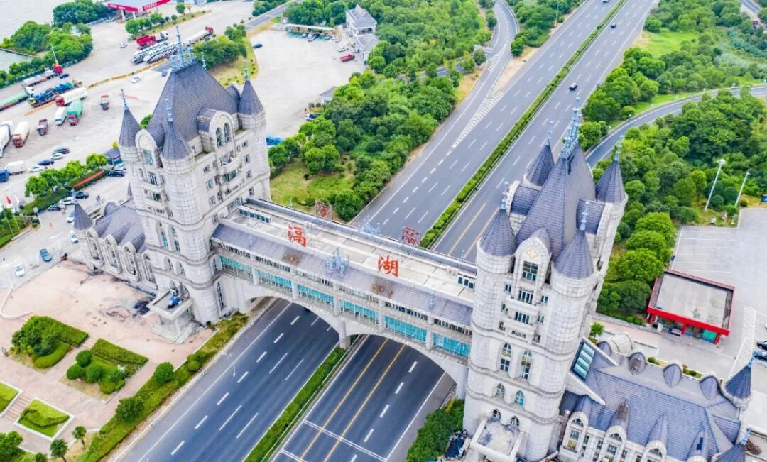 在江苏宁常高速段,一座犹如欧洲中世纪城堡的的高大建筑横跨在高速公路上,城堡上两个大字“滆湖”,提醒着过往的车辆,从地下经过时候会有穿越凯旋门的仪式感。