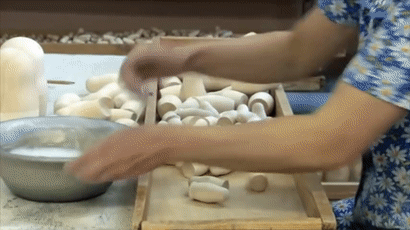 所以,就需要马铃薯糊出场了。工人要在人偶身上涂上一层类淀粉的胶水糊。这样一来,既可以让套娃表面变得光滑易上色,又可以替代现代的底漆,使人偶对儿童安全无毒。