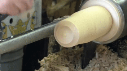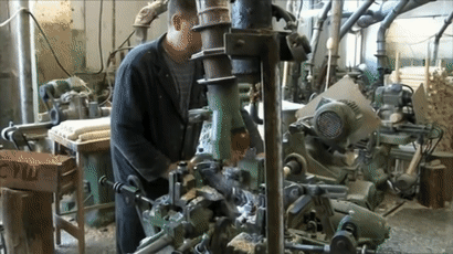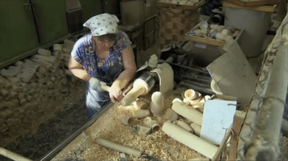 合体后的人偶在工人的雕磨之下,已经可以看出雏形。然后,雕刻师找到套娃底座,把整枚人偶从木材上割下来。