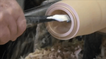 接下来,要雕刻大一号的人偶上半部了。挖好空之后,工人把刚才做好的小人偶往里塞一下,确认空间大小。然后就是重复工序啦!