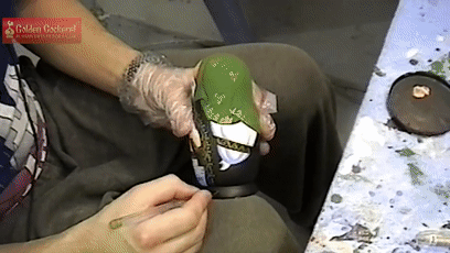 在颜料干燥后,工人必须直接用双手蘸漆,为套娃附着最后的保护层。