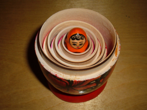 套娃,是产于俄罗斯的一套逐渐缩小的木制娃娃,它们可以从人偶中部打开,一个接一个地摆放在一起。