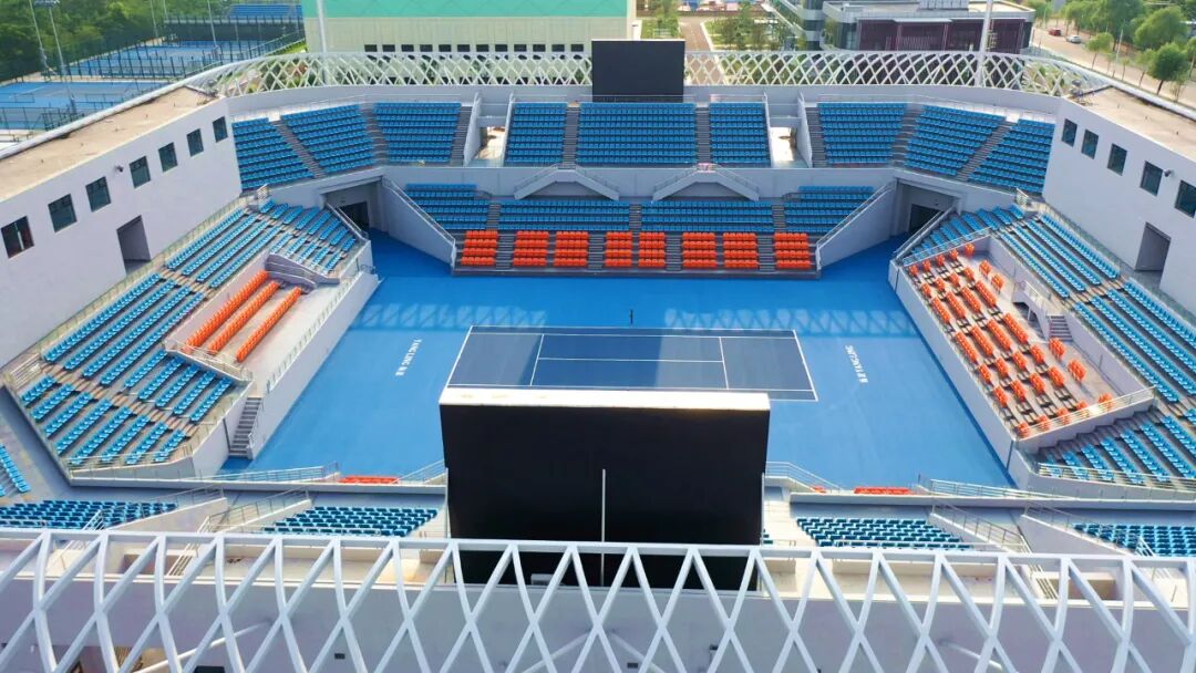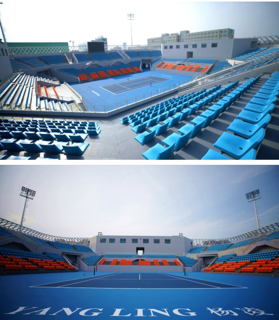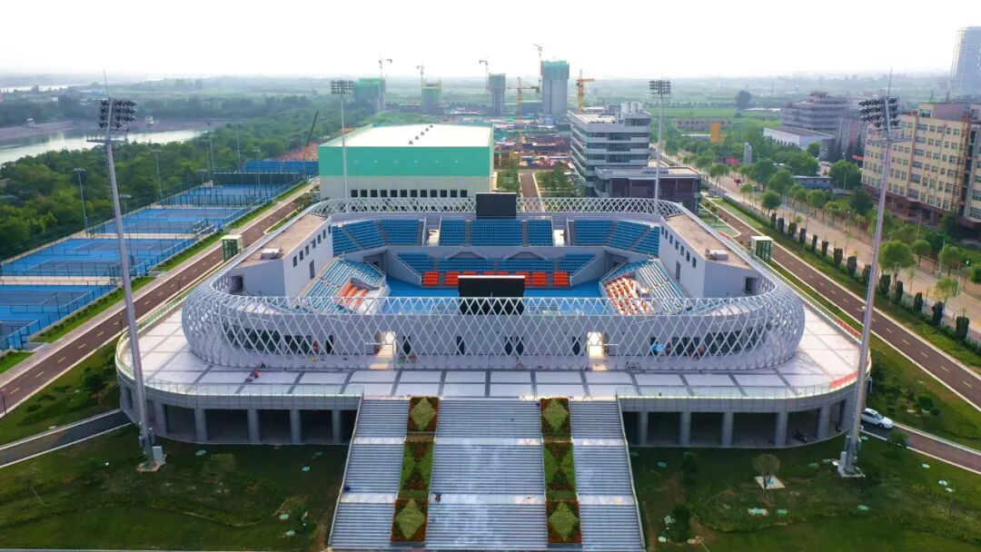 51、杨凌网球中心:位于杨凌示范区内,北靠滨河西路,南临陕西省水上运动中心。占地142.24亩,总建筑面积3.5万㎡,配套设施齐全。中心包括:一个约4110座的中央球场,一个约1200座的副主场,10片室外标准比赛场地(约200座),4片室外标准训练场地,一个室内网球馆(5片标准比赛场地,约490座)。承担十四运会网球比赛项目。