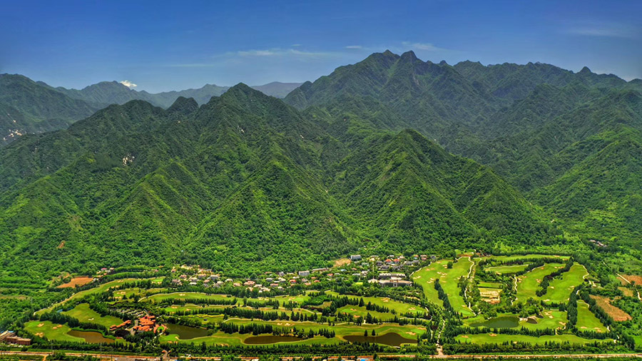 5、西安秦岭国际高尔夫球场:位于西安市鄠邑区草堂旅游度假区,占地1200余亩,球道总长7240码,18洞72杆,果岭面积1.16万㎡,水域面积约3.73万㎡,沙坑108个约1.21万㎡。承担十四运会高尔夫比赛项目。