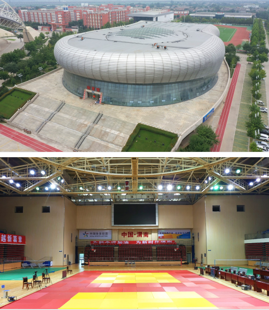 50、韩城西安交大基础教育园区体育馆:位于韩城市新城区韩塬路以东,西安交大韩城基础教育园区西侧。占地面积32.42亩,总建筑面积24003.53㎡。乙级综合体育馆,分主馆和副馆两部分,主馆作为十四运柔道比赛场地,副馆作为运动员赛前热身使用,座位数4578个。承担十四运会柔道比赛项目。
