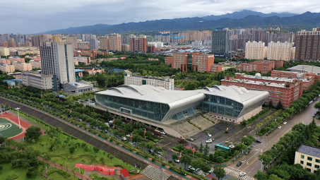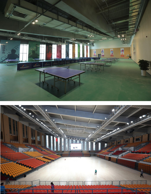 42、延安大学体育馆:位于延安市新区延安大学校区内。乙级体育馆,总建筑面积27520.55㎡,体育馆建筑面积20014.53㎡,座位数4060个。承担十四运会乒乓球比赛项目。