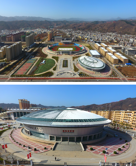 48、商洛市体育馆:位于商洛市丹南新区,东临商鞅大道,西靠丹南大道,南傍马莲峪河,北邻商洛职业技术学院。乙级体育馆,占地面积32亩,建筑面积12000㎡,座位数4100个。承担十四运会排球-女子19岁以下组比赛项目。