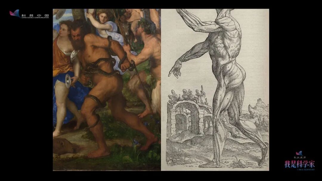 《酒神巴克斯与阿里阿德涅》中这位精壮汉子,他的形象是不是和右边非常相似?左边这幅画《酒神巴克斯与阿里阿德涅》,作者是提香·韦切利奥,但是这幅画里边的这个人物明显是米开朗基罗的风格,只有他才善于画这种肌肉健硕的人体。而右边《人体的构造》里面的图谱是维萨里和提香的学生让·范·卡尔卡一起合作的,但也是米开朗基罗的风格。这正是艺术家们相互模仿过程中一个明显的见证。