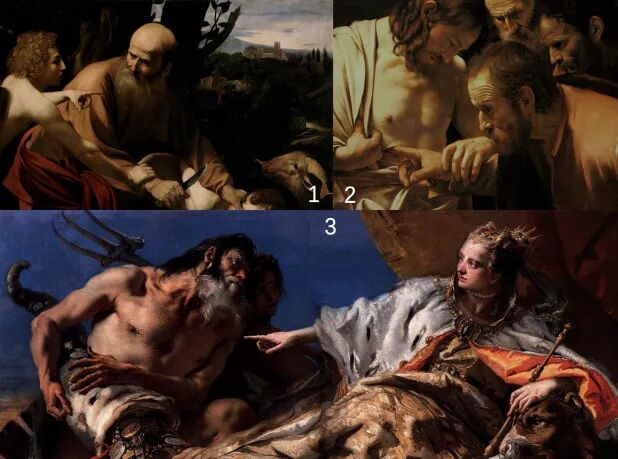 这个手势在之后的艺术作品中还出现过。比如,卡拉瓦乔的《以撒的献祭》(图1),卡拉瓦乔的《多疑的圣马太》(图2)——在他的笔下,圣马太真的把自己的食指伸到了耶稣的伤口之中。这幅画还来到过中国,前几年在国家博物馆的威尼斯与威尼斯画派展览中展出过。提埃波罗的作品《海神向威尼斯馈赠礼物》(图3),可以看到威尼斯女神手也是这样一个手势。
