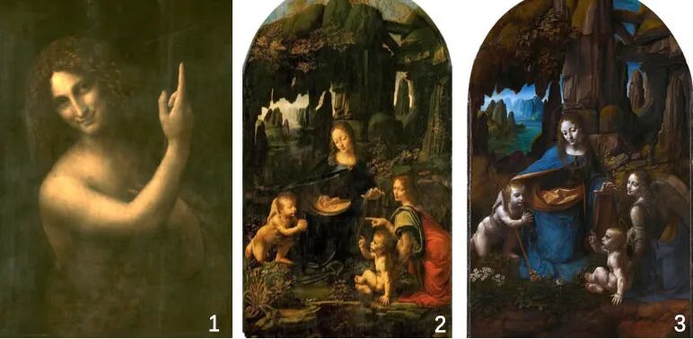 在他的作品之中,《施洗者圣约翰》(图1)、《岩间圣母》和《酒神巴克斯与阿里阿德涅》都出现了这只手的范式。尤其是中间这幅《岩间圣母》(图2)。这个艺术家绘出的这只手,我们正常人做得出来吗?做不出来。因为如果摆这个姿势,她的手是不够长的。在《岩间圣母》的第二版(图3)中,达芬奇去掉了这只手,整个画面反而更加和谐和平衡。这样看来,第一版更像是一个单纯的炫技——我能画出这样一只精巧的手!
